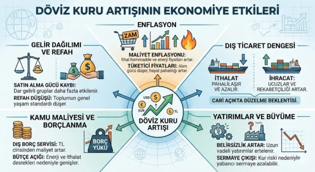 Döviz kuru artışı, eğer kontrollü ve öngörülebilir bir şekilde gerçekleşiyorsa ihracatı destekleyerek ekonomiye dinamizm katabilir. Ancak ani ve sert yükselişler (devalüasyon atakları); enflasyonu tetikler, yatırımcı güvenini zedeler ve toplam refahın düşmesine neden olur.